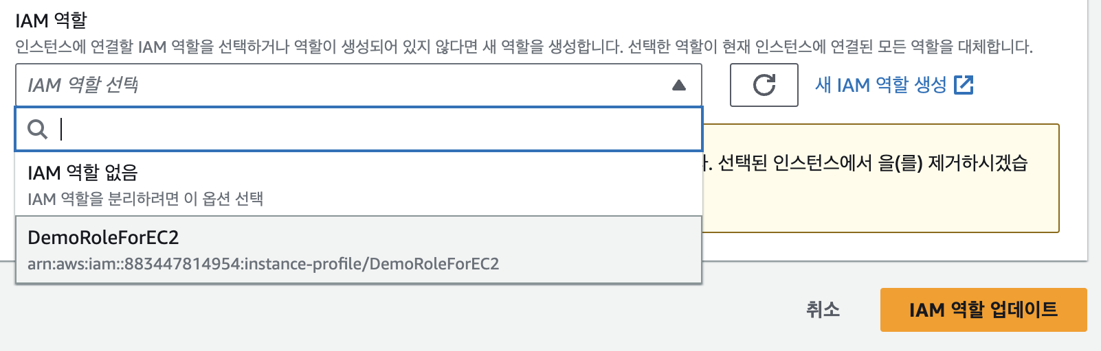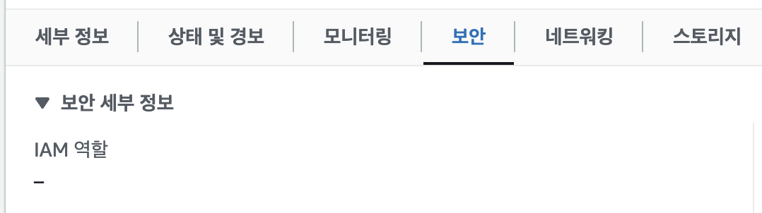 현재는 EC2 인스턴스에 IAM Role이 없는 상황이다. 이때 인스턴스의 [IAM Role 변경]에서 기존에 생성한 IAM Role을 연결하면,
