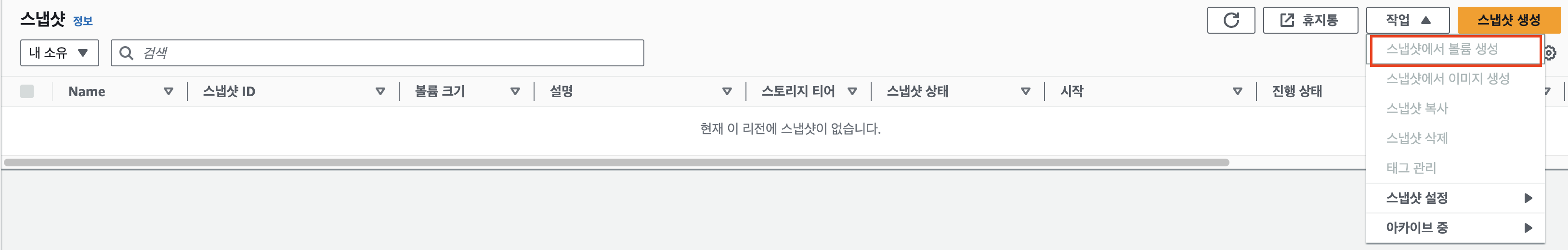 → Snapshot을 이용해 새 볼륨 생성: [Create Volume from Snapshot]