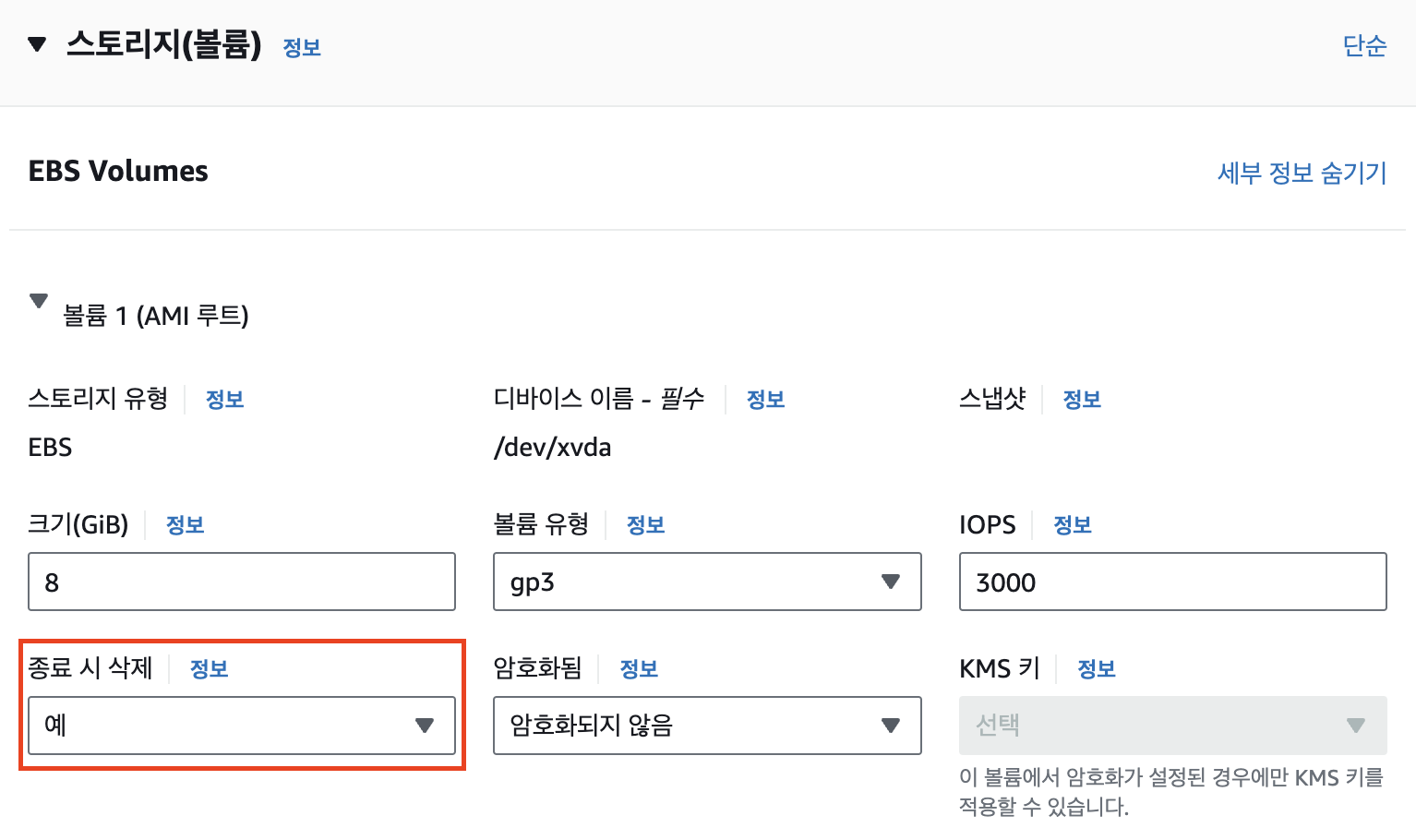 기본적으로 Root EBS Volume은 인스턴스 종료와 함께 삭제되도록 설정되어 있다. 다른 EBS Volume은 비활성화가 Default이다.