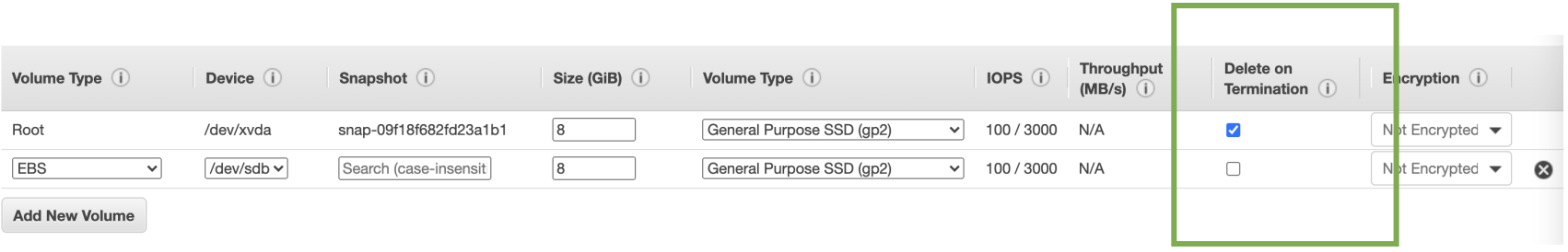 즉, 새로운 EBS Volume을 생성하고 인스턴스에 연결했을 때 원래 연결되어 있던 EBS Volume은 인스턴스 종료 시 삭제가 Default이다.