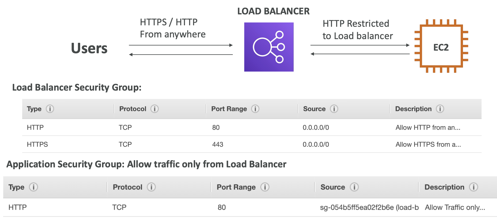 → EC2 인스턴스는 Load Balancer에서 온 트래픽만을 허용하게 되는 강화된 보안 메커니즘이 되는 것이다.