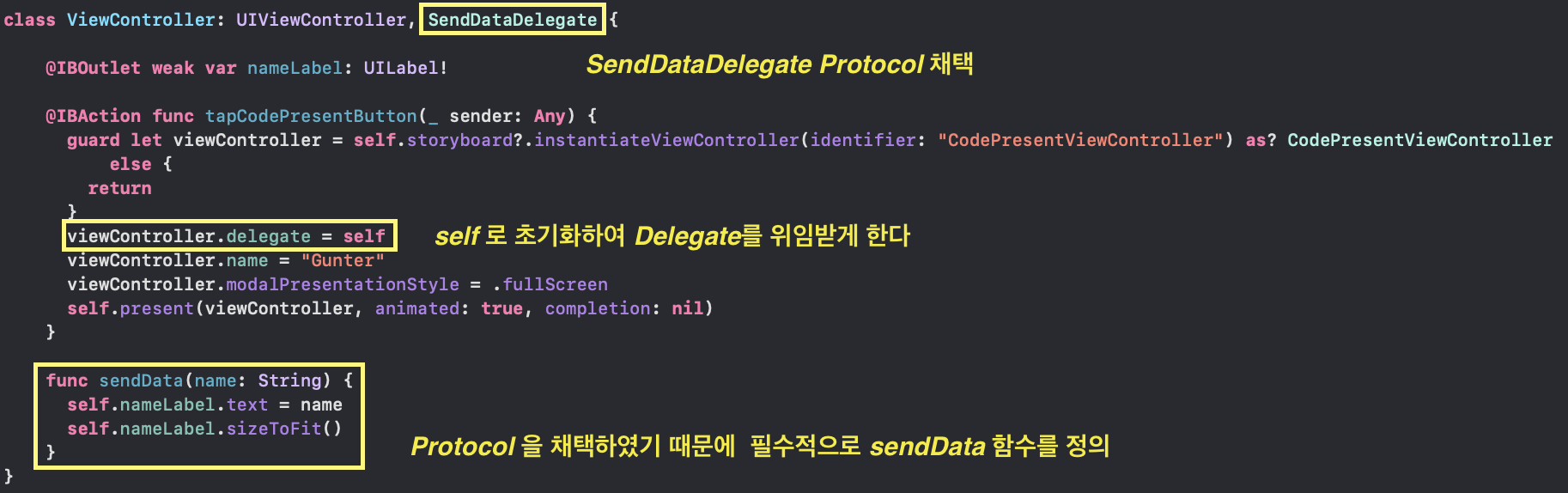 4) ⓓ ViewController 에서 선언한 프로토콜을 채택한 후, self 로 초기화하여 delegate 를 위임받게 한다.