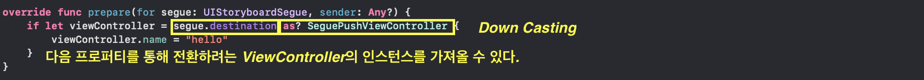 1) ⓐ ViewController 의 메서드에 instantiateViewController 를 호출하여 데이터를 전달할 ⓑ ViewController 로 Down Casting 하여 ⓑ ViewController 의 프로퍼티에 접근한다.