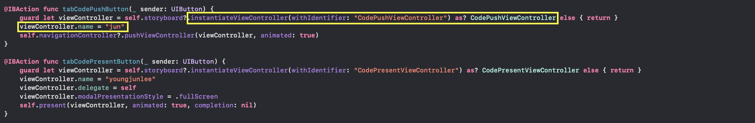 Code 로 Present / Push 되는 화면 전환 방법에서의 데이터 전달